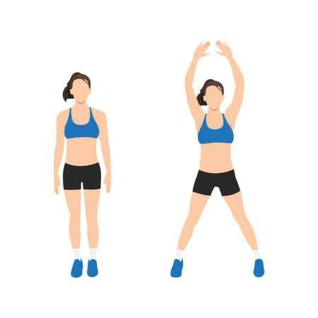• Como fazer: Com os pés juntos e braços ao lado do corpo, salte abrindo pernas e braços ao mesmo tempo. Volte à posição inicial e repita.